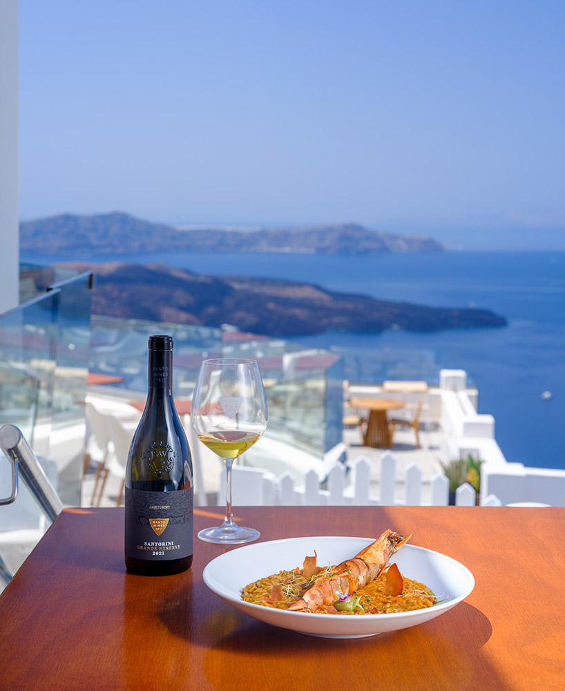 Yamas (cheers) to the dramatic views at Venetsantos Winery! Carved into a cliff, this winery offers front row seats to the caldera…